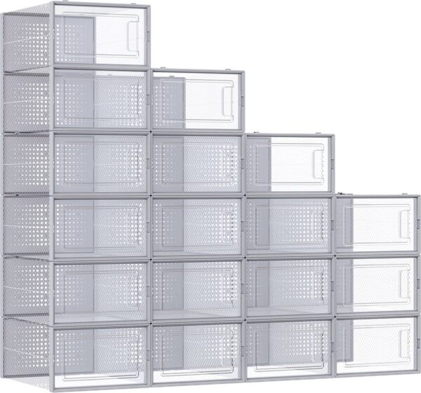 18-pack schoenendoosorganizer – opbergcontainer – stapelbare dozen – transparant grijs – PP-materiaal – ABS-frame – 33,5 cm x 23,2 cm x 14,3 cm – Schoenen efficiënt organiseren (6097636140167)
