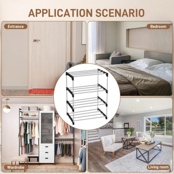 Ons metalen schoenenrek maakt flexibele montage mogelijk, die vrij kan worden geschakeld tussen 2 en 4 lagen, stelt je in staat om de hoogte van elke laag vrij te kiezen voor verschillende schoenmaten, van platte schoenen tot laarzen. Het hele schoenenrek met 4 niveaus meet 42 x 25 x 51 cm (lengte x breedte x hoogte). (EAN: 8785305748346)