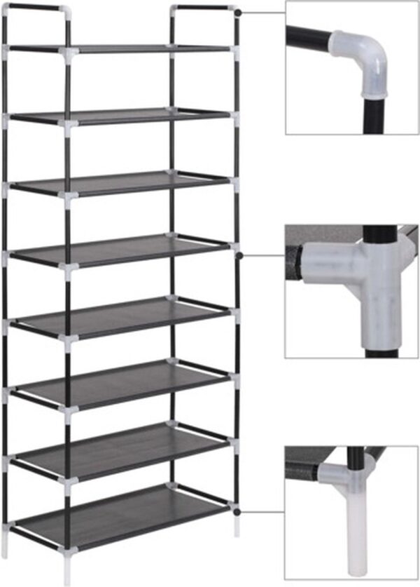 Het heeft een buisvormig, metalen frame dat lichtgewicht en toch stevig is, waardoor het schoenenrek gemakkelijk te verplaatsen en vrij duurzaam is. Het rek heeft 8 royale schappen die gemaakt zijn van nonwoven stof en voldoende ruimte bieden om je schoenen netjes op te kunnen bergen.